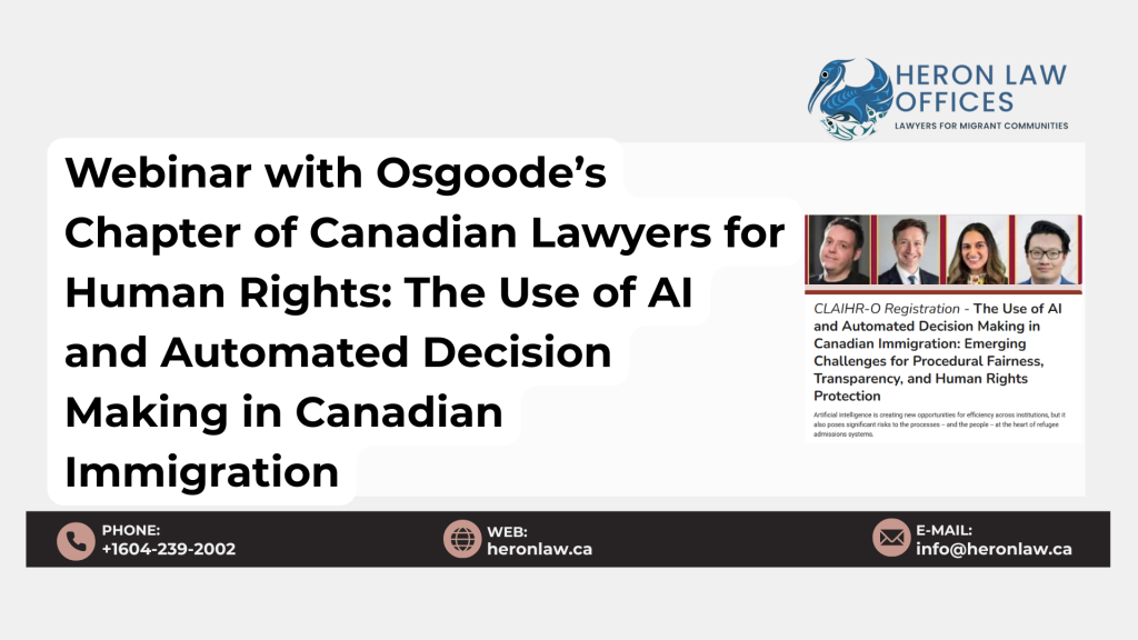 Later today, Heron Law Offices will be participating in a panel hosted by Osgoode Hall Law School’s Canadian Lawyers for Human Rights (CLAIHR), titled “The Use of AI and Automated Decision-Making in Canadian Immigration.”